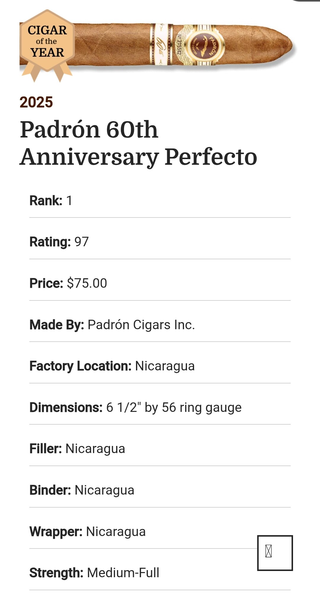 Tko ima sreće probati ovu cigaru, može očekivati prepoznatljive note tamne čokolade i kave, koje su majstorski izbalansirane s nijansama pečenih orašastih plodova. Iako cijena od 75 dolara na američkom tržištu smješta ovu cigaru u kategoriju za posebne prilike, njezina rijetkost i profil okusa čine je nezaobilaznim iskustvom za svakog ozbiljnog kolekcionara. Padrón je još jednom dokazao zašto su uvijek u samome vrhu.
