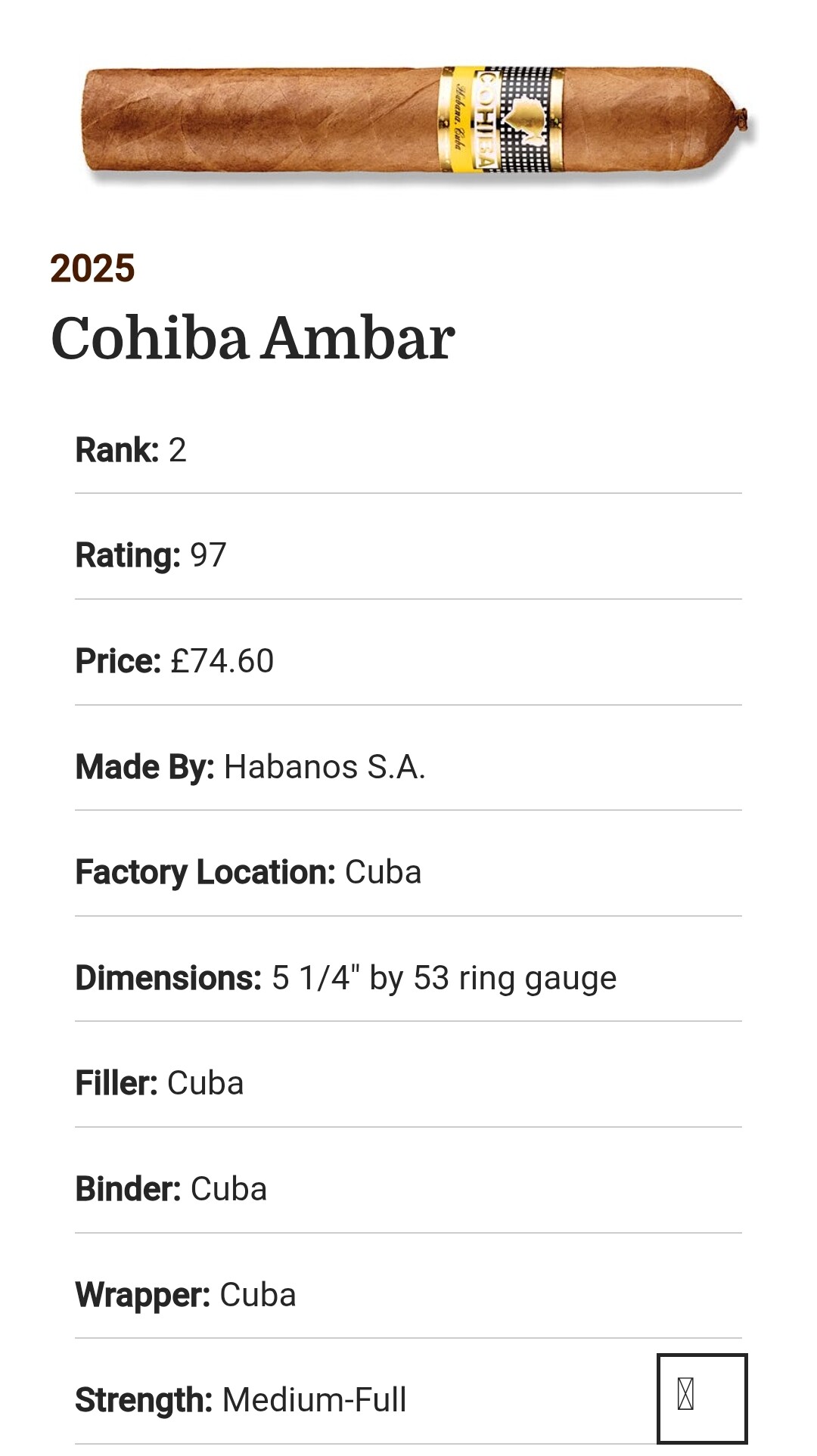 Ova prestižna kubanska cigara, koja je zauzela visoko 2. mjesto na listi najboljih u 2025. godini s izvanrednih 97 bodova, predstavlja vrhunac luksuza i profinjenosti. Cohiba Ambar je najnoviji dodatak stalnoj liniji brenda, osmišljen kako bi zadovoljio ljubitelje bogatih, ali savršeno balansiranih aroma.