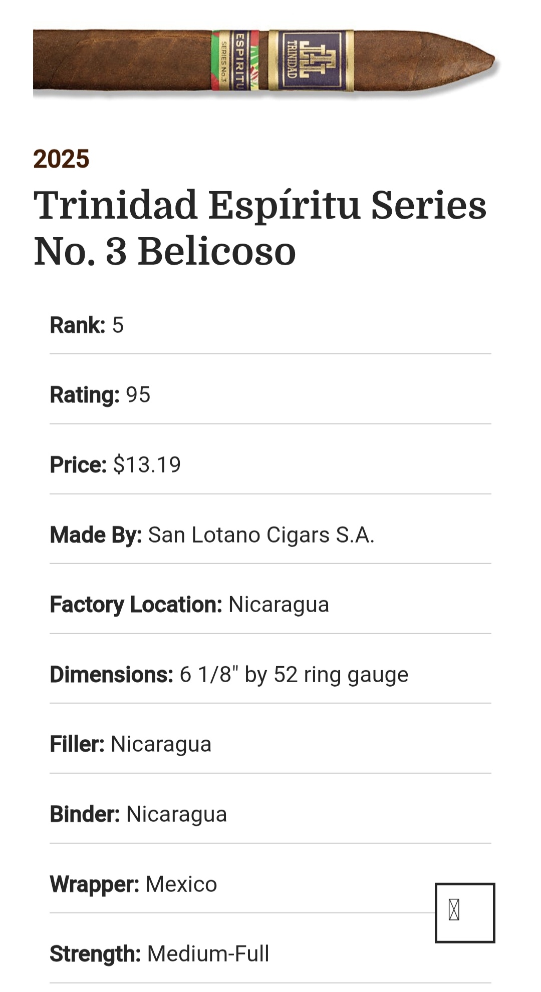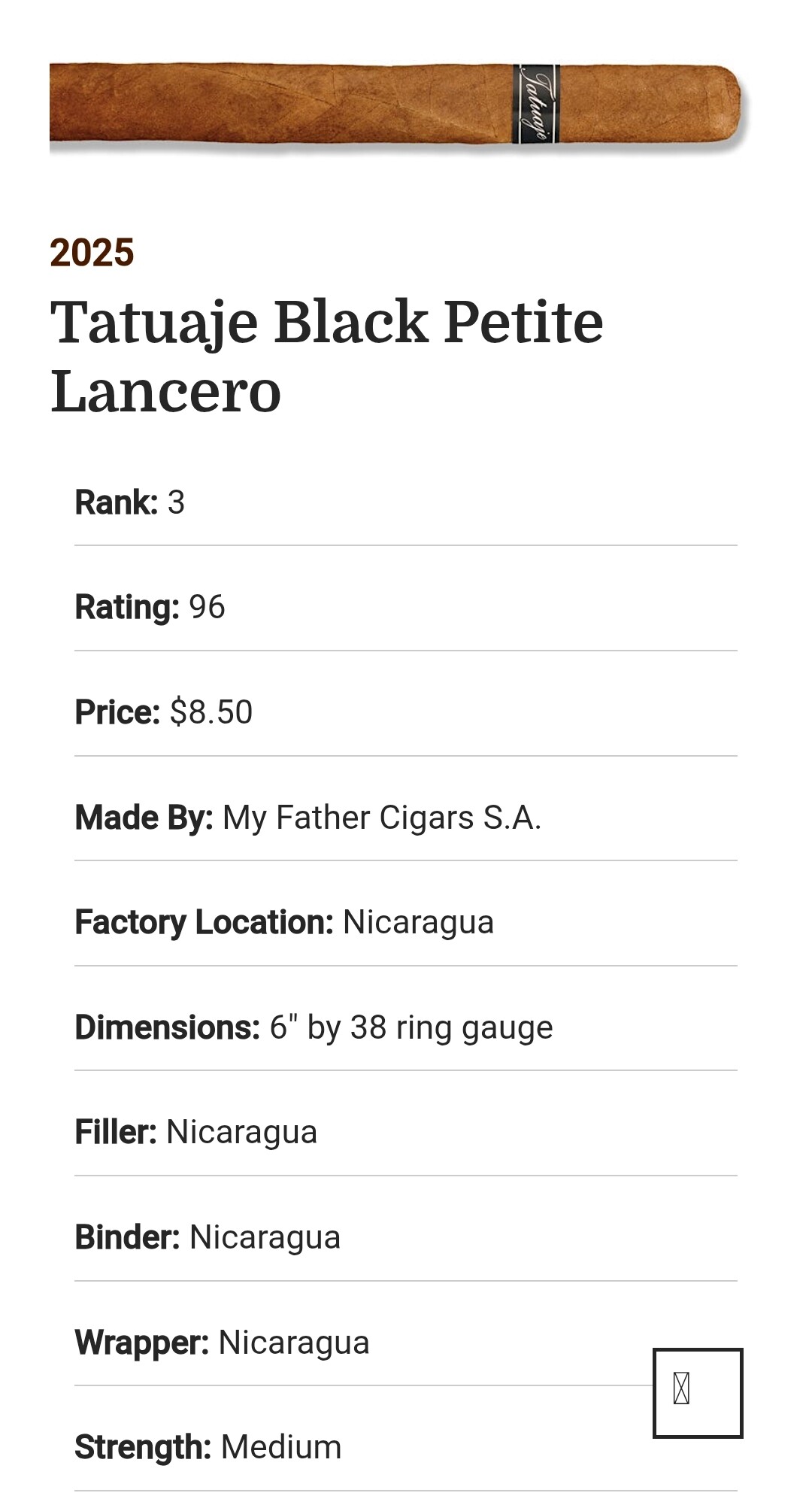 Ova elegantna cigara (6" x 38) dobila je impresivnih 96 bodova i predstavlja pravi dragulj za ljubitelje preciznih, fokusiranih okusa. Riječ je o nicaraguanskom “puru” koji se proizvodi u poznatoj tvornici My Father Cigars. Iako je godinama bila privatna mješavina vlasnika Petea Johnsona, danas je dostupna svima.